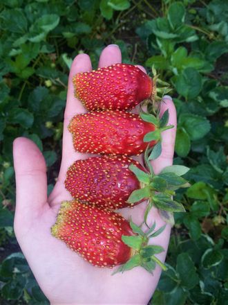 По срокам созревания земклуника относится к среднеспелым.Первые ягоды самые крупные, длиной до 6 см, средний размер — 3 см, вес — 3.7 г максимум — 17 г, однако, садоводы получали и более крупные — по 20–30 г. С одного куста можно собрать 500 г ягод. Их форма — вытянутая, сплюснутая, некоторые ягоды напоминают лопатку.