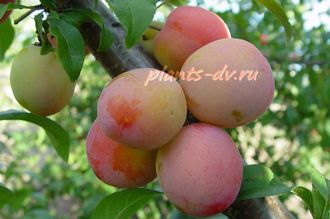 Плоды крупные, средней одномерности, овальной формы, средняя масса плода 42,1 г, максимальная – 51, 2 г. Вершина плода округлая, воронка мелкая. Брюшной шов мелкий. Плодоножка короткая, хорошо отделяется от ветки, прикрепление к косточке непрочное. Основная окраска плода – желтая, покровная розовая, подкожных точек нет, с небольшим восковым налётом. Кожица нежная, голая, с плода снимается легко. Мякоть зеленовато – желтая, сочная, сладко – кислого вкуса. Дегустационная оценка – 4,8 балла. Косточка крупная от мякоти отделяется плохо. Транспортабельность плодов средняя. Срок созревания плодов ранний, 5 – 10 августа. Урожайность с одного дерева – 11,7 кг, максимальная – 13,4 кг.